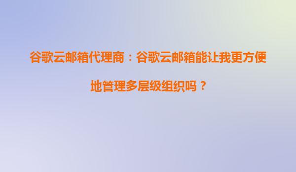 2025-10-06谷歌云郵箱代理商:谷歌云郵箱能讓我更方便地管理多層級(jí)組織嗎? 在當(dāng)今數(shù)字化時(shí)代,企業(yè)組織架構(gòu)日益復(fù)雜,多層級(jí)管理成為常態(tài)。如何高效管理這些層級(jí),確保信息流通順暢、協(xié)作無(wú)縫進(jìn)行,成為企業(yè)IT管理的重要...