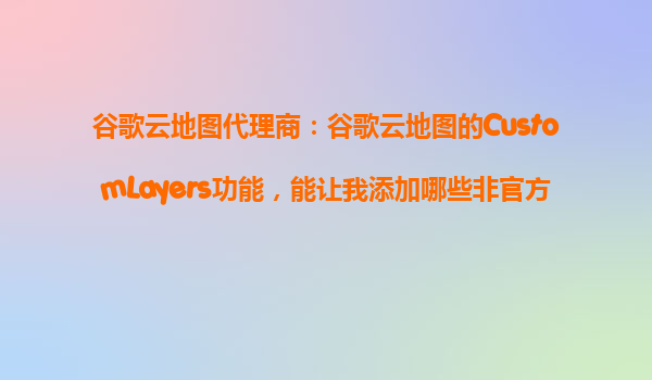 2025-10-31谷歌云地圖代理商優(yōu)勢解析:CustomLayers如何賦能非官方數(shù)據(jù)整合 一、CustomLayers功能的核心能力 谷歌云地圖的CustomLayers是面向企業(yè)級用戶推出的深度定制功能,允許開發(fā)者通過代理商...