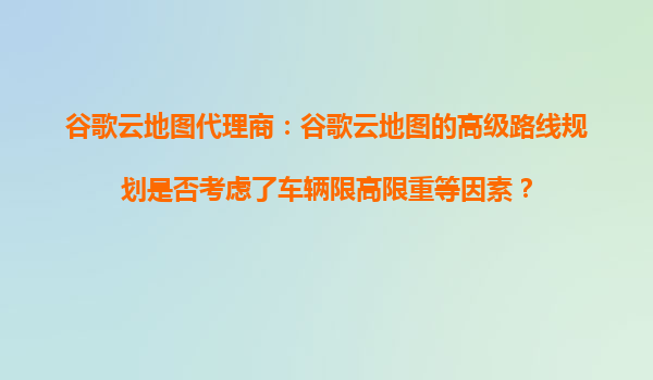 2025-10-18谷歌云地圖代理商:谷歌云地圖的高級路線規(guī)劃是否考慮了車輛限高限重等因素? 引言 在物流運輸和交通管理中,車輛路線規(guī)劃是一個關(guān)鍵環(huán)節(jié)。尤其對于大型貨車或特種車輛,限高、限重、限...