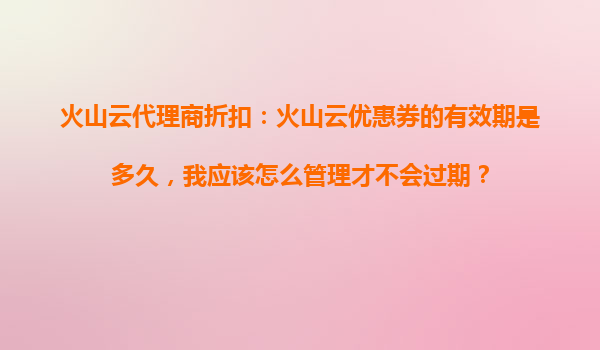 2025-10-21火山云代理商折扣:火山云優(yōu)惠券的有效期是多久,我應該怎么管理才不會過期? 一、火山云優(yōu)惠券的有效期解析 火山云優(yōu)惠券是代理商及用戶享受折扣的重要工具,其有效期通常由火山云官方或代理商根據(jù)活動規(guī)...