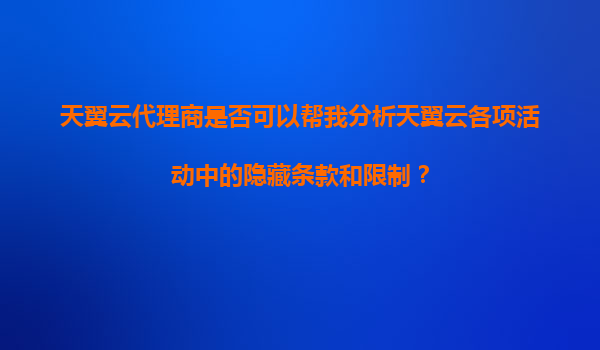 2025-11-05天翼云代理商能否幫我分析活動中的隱藏條款和限制?專業(yè)解析與優(yōu)勢對比 一、天翼云代理商的核心價值與職能 天翼云官方代理商是經(jīng)過中國電信認(rèn)證的服務(wù)伙伴,其核心價值在于: ...